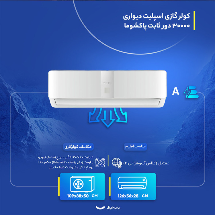 نمایشگر دیجیتال روی ریموت , کنترل کامل تنظیمات دما و فن , تنظیم تایمر از طریق ریموت , تنظیم جهت پرتاب باد از راه دور , قابلیت تنظیم حالت توربو از ریموت , طراحی ارگونومیک و سبک