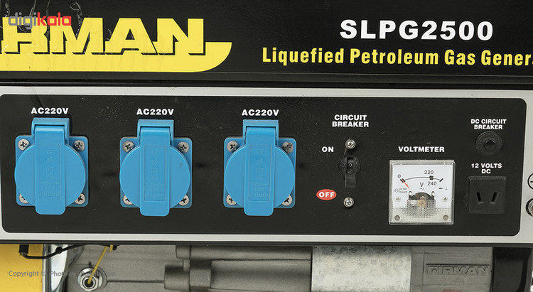 - دارای ولتمتر - پریزهای دارای درپوش - فاکتور قدرت: 1 - سوخت LPG - اتصال مستقیم به کپسول گاز
