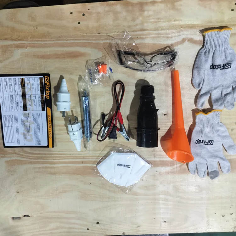 دستکش - ماسک- عینک - تعدادی آچار - قیف - سوکت - دو شاخه