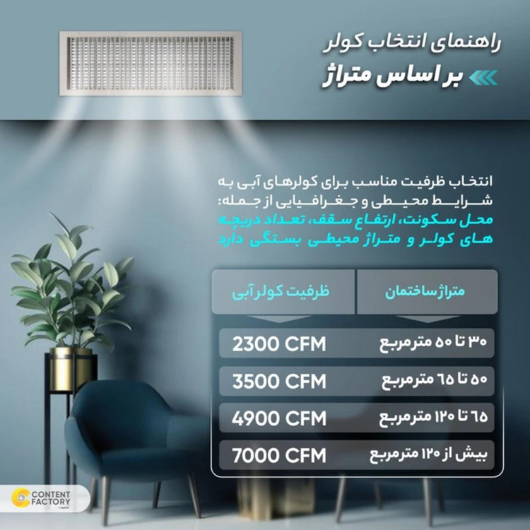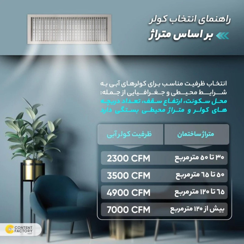 بین ۵۰ تا ۷۰ متر مربع (کولرهای با حجم ۳۰۰۰ تا ۳۵۰۰) (متناسب با شرایط محیط)