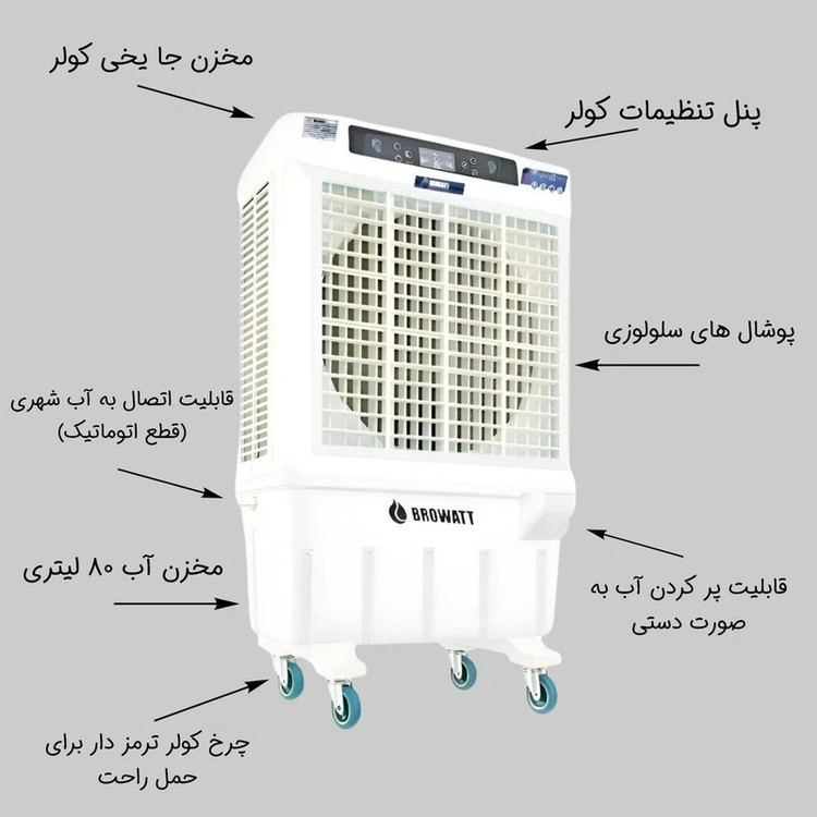 امروزه با گرم تر شدن شدیدا هوا طی سالیان اخیر نیاز به استفاده برای کولر چه آب و چه گازی برای انسان ها یکی از واجبات بوده است. کولرهای آبی پرتابل که با نام اختصاری پرتابل بیشتر شناخته می شوند سهم بیشتری از بازار هدف نه تنها در ایران بلکه دنیا را فرا گرفته اند. کولر پرتابل سلولوزی سایز بزرگ بروات مدل P-BR 32000 یکی از محصولات جدید سرمایشی شرکت بروات است که نه تنها در ایران بلکه در کشورهای حوزه خلیج فارس نیز به دلیل کیفیت ساخت در بدنه و سلولوز موجود در آن ها پر فروش هستند. این کولر با طراحی خاص و منحصر بفرد خود با توربین بزرگ و قدرت پرتاب بالا نیازهای یک متراژ 100 تا 140 متری را جواب می دهد. این کولر مجهز به نمایشگر دیجیتال و کنترل از راه دور دارد است که این امکان را به شما میدهد تا سرعت باد، نوع باد، فعال کردن پره های عمودی، ... را کنترل کنید. این کولر از مخزن بزرگ 80 لیتری خود بهره می برد به طوری که هوشمند بوده و جریان آب را کنترل می کند. شما به صورت دستی نیز می توانید مخزن 80 لیتری را پر کنید. هوادهی 3800 متر مکعب در ثانیه این کولر خود را از بقیه رقبا جدا کرده و بهترین هوادهی و بازخود را به شما می دهد. در بالای این کولر محفظه جا یخی وجود دارد که 3 عدد جا یخی در بالای کولر قرار میگیرد. کاربد این جا یخی به این صورت است که اگر خواستید برودت کولر را بیشتر کنید باید این جا یخی ها را پر از آب کرده و در یخچال فریزر گذاشته تا یخ بزند. بعد از یخ زدن در بالای کولر بگذارید. موقعی که آب از مخزن به سمت بالا بیاید، آب از روی جا یخی ها رد شده و برودت هوا را بیشتر خواهد کرد. این محصول موقع کار کم صدا بوده و لغزشی ایجاد نمی کند. 4 چرخ زیر کولر نیز این امکان را به شما می دهد تا به راحتی این کولر را حمل کنید. ویژگی بارز این محصول این است که به نسبت و کیفیت بالا جایگزین بسیار توجیه پذیری نسبت به کولر های آبی فلزی و همین طور کولر های گازی دارد. پوشال های این کولر از نوع سلولوزی بوده و برای سلامتی شما هم ضرری ایجاد نمی کند.